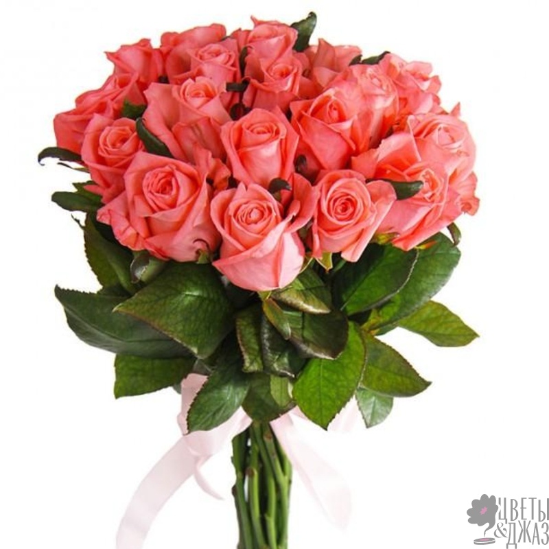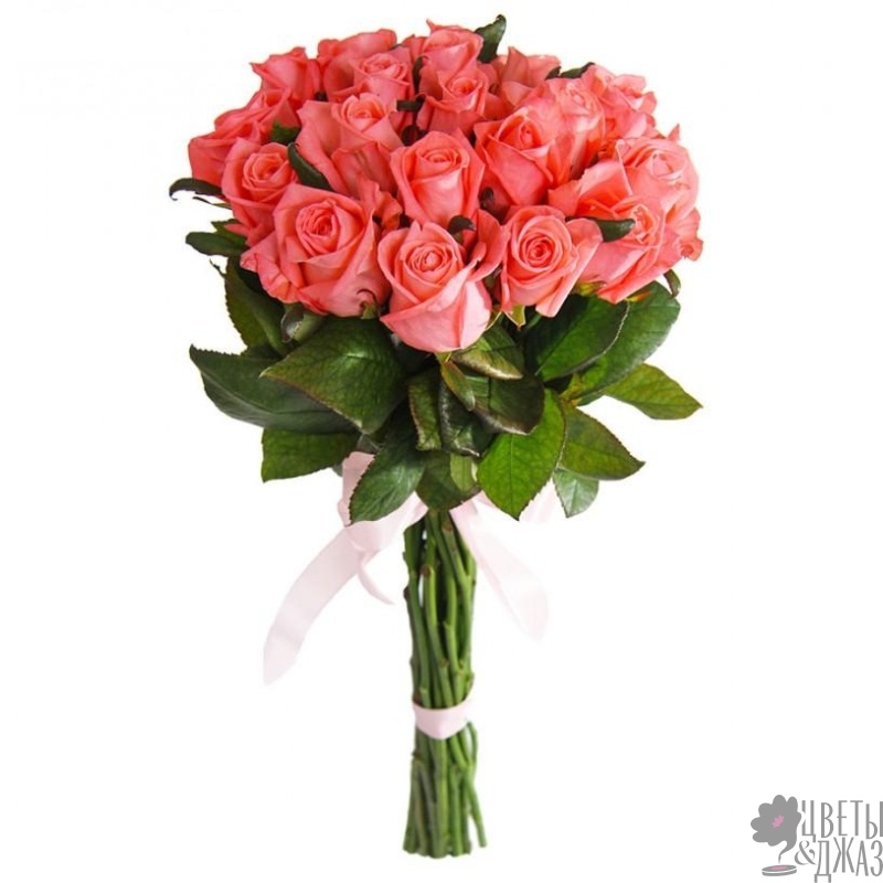 Букет состоит из 25 коралловых роз, прозрачная упаковка, атласная лента.