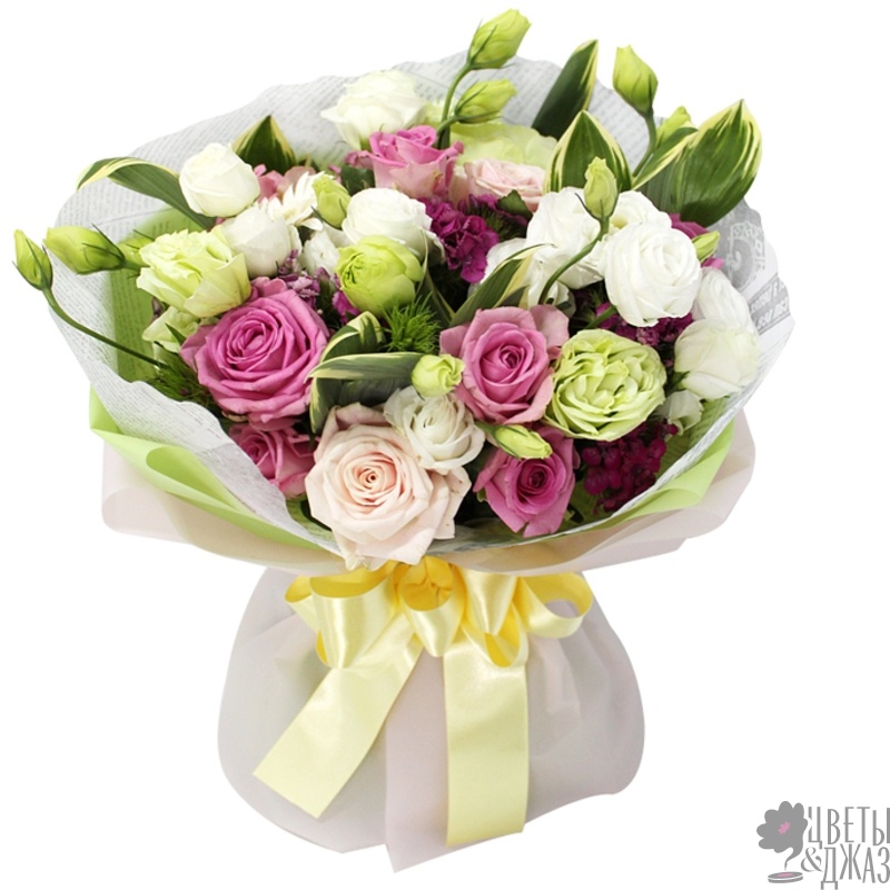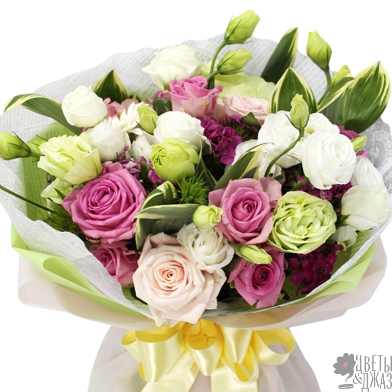 Букет состоит из 13 роз, 3 ветки эустомы, рускус, красивая упаковка, атласная лента.