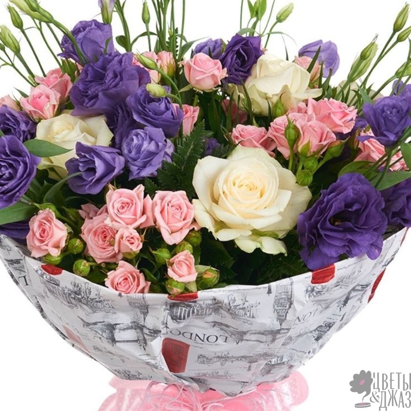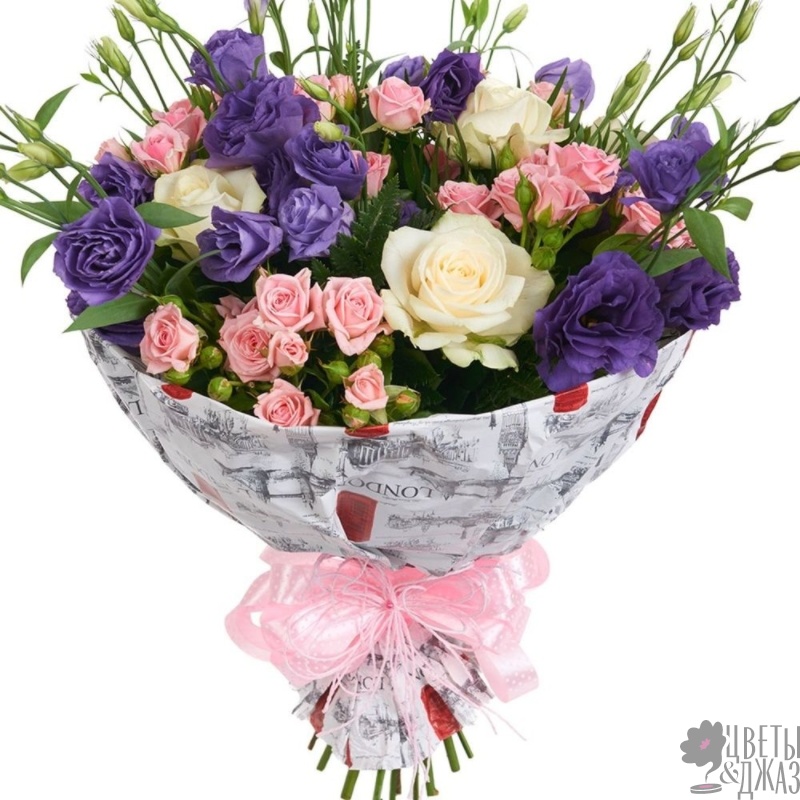 Букет состоит из 3 белые розы, 5 розовых кустовых роз, 5 веток эустомы, зелень, красивая упаковка, атласная лента.