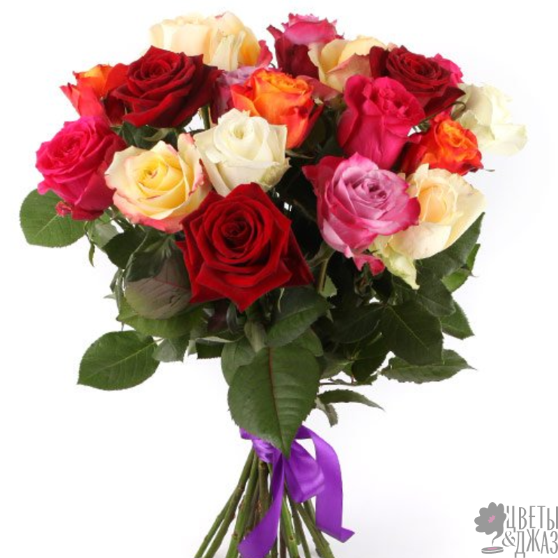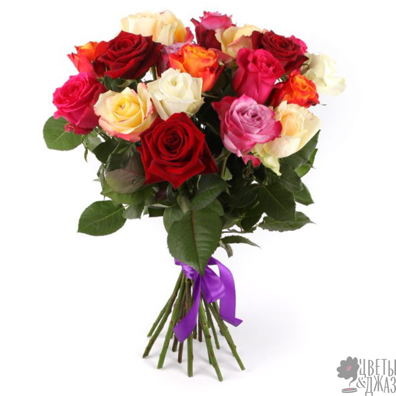 Букет состоит из MIX из 21 розы, прозрачная упаковка, атласная лента.