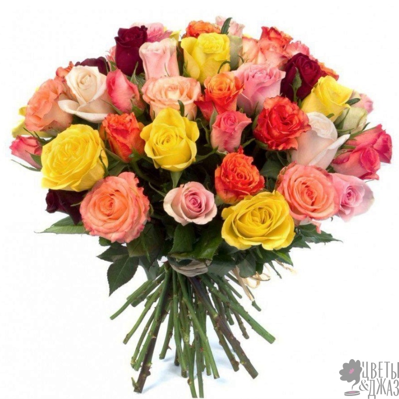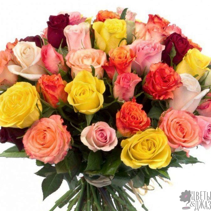 Букет состоит из MIX из 31 розы, прозрачная упаковка, атласная лента.