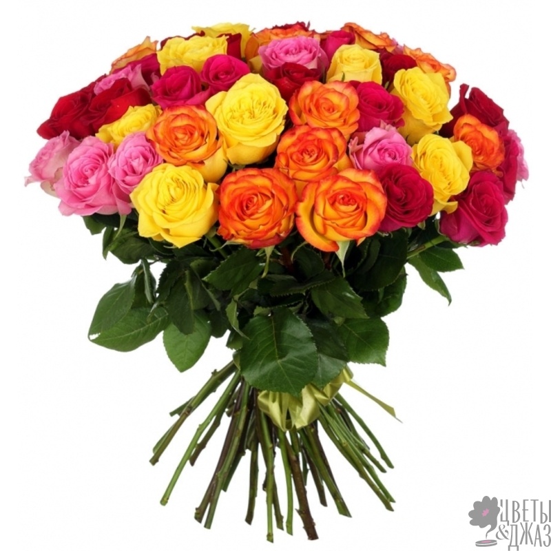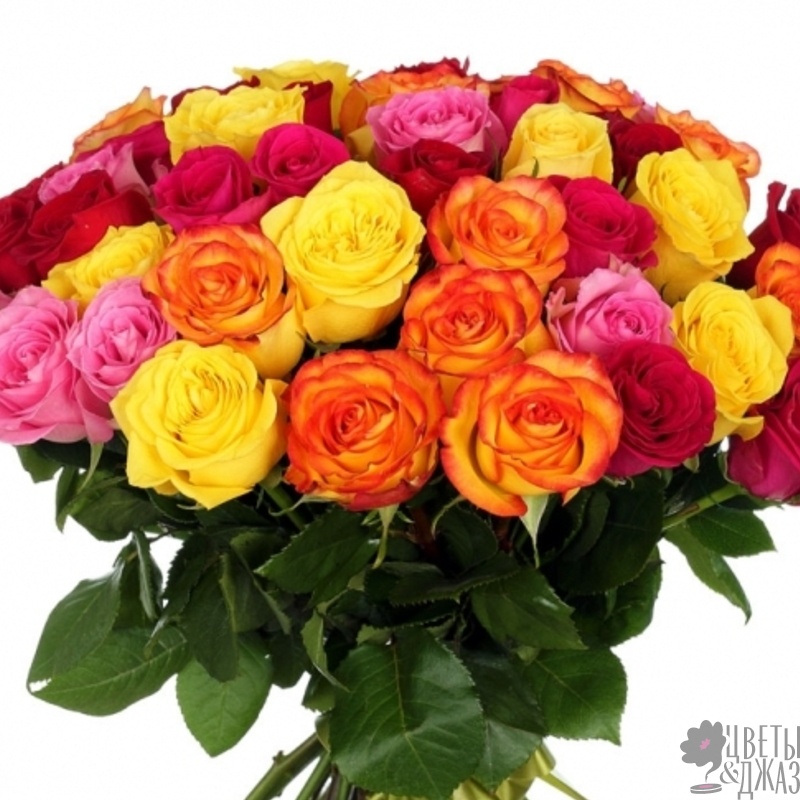 Букет состоит из MIX из 35 роз, прозрачная упаковка, атласная лента.
