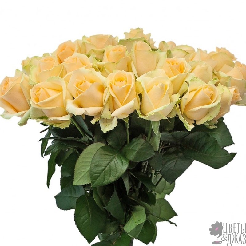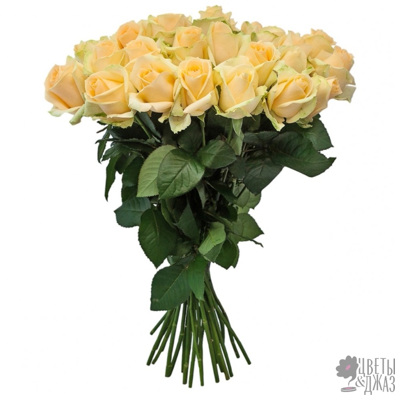 Букет состоит из 31 кремовая роза, прозрачная упаковка, атласная лента.