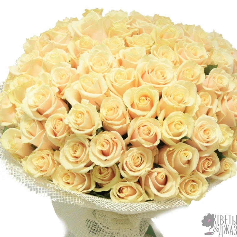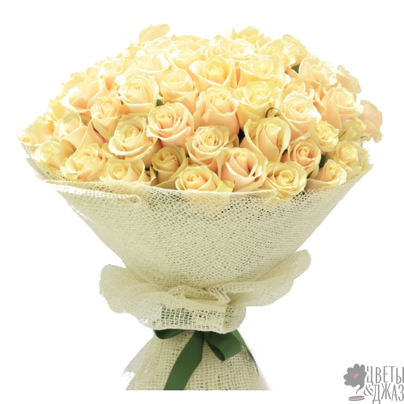 Букет состоит из 55 кремовых роз, красивая упаковка, атласная лента.