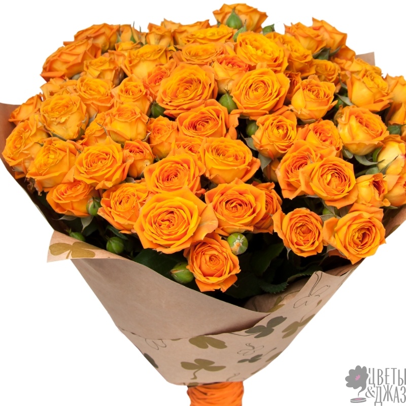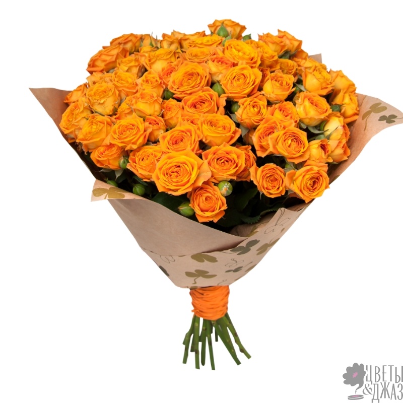 Букет состоит из 17 оранжевых кустовых роз, крафт, атласная лента.