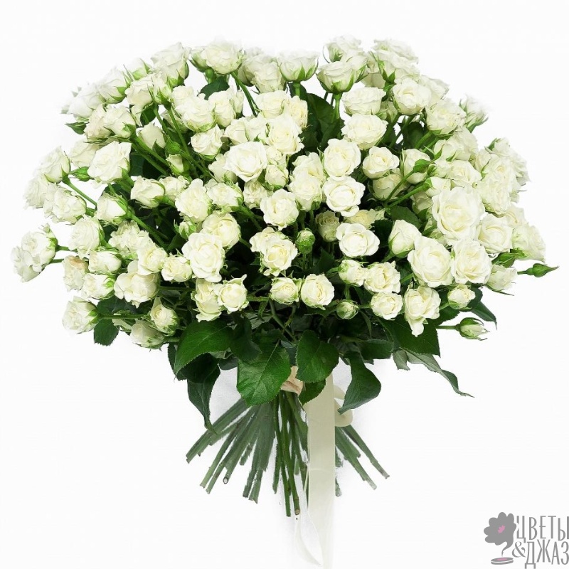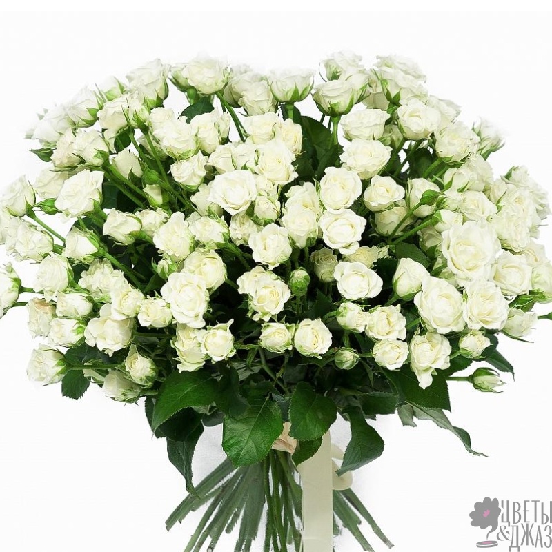 Букет состоит из 35 белых кустовых роз, прозрачная упаковка, атласная лента.