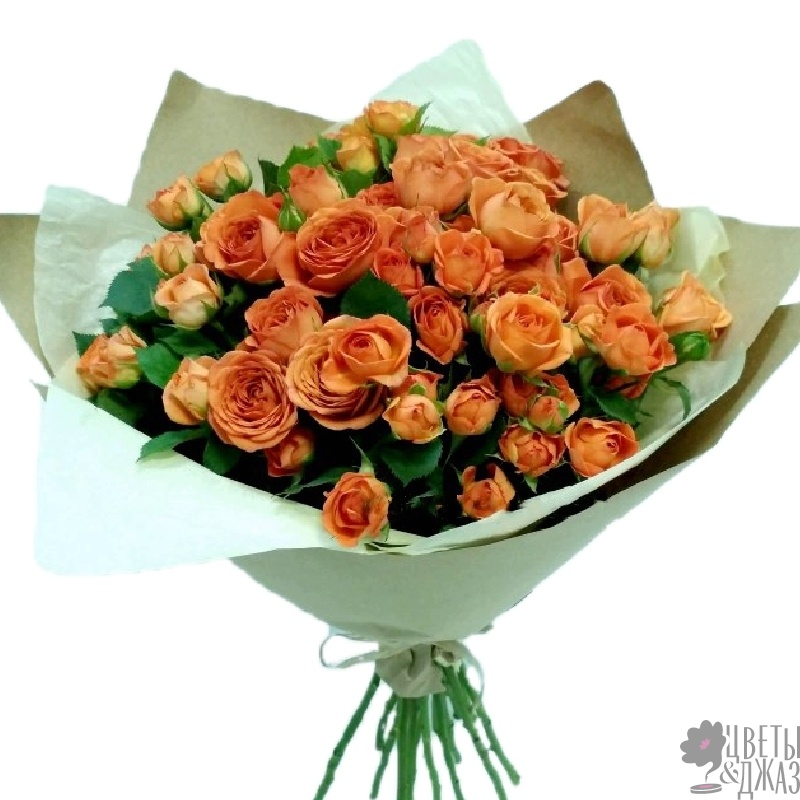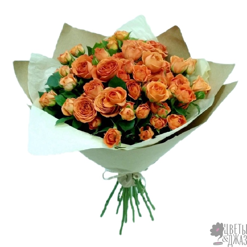 Букет состоит из 15 оранжевых кустовых роз, крафт, атласная лента.