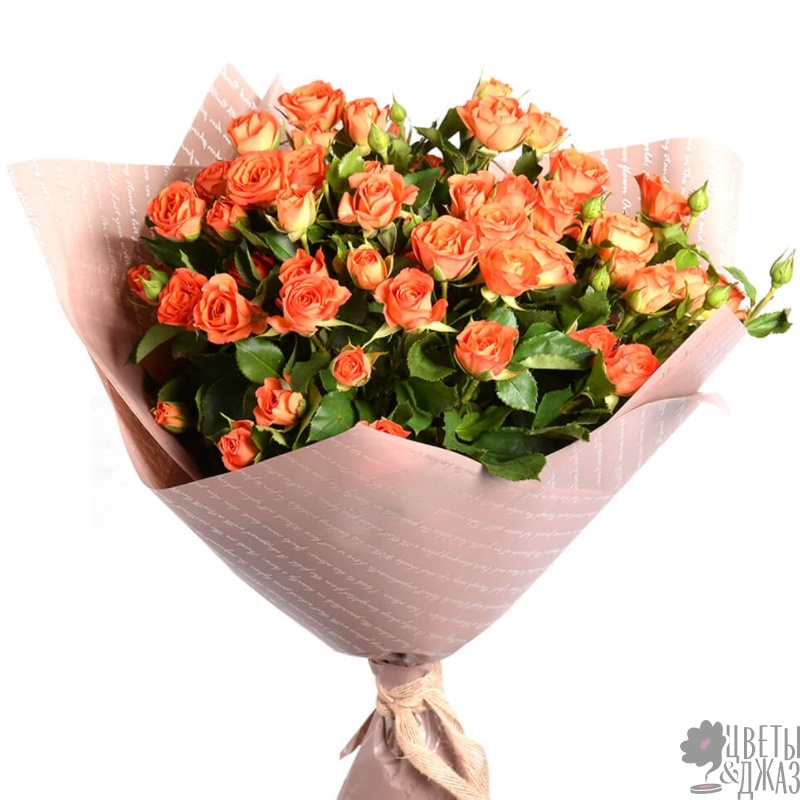 Букет состоит из 19 оранжевых кустовых роз, крафт, атласная лента.