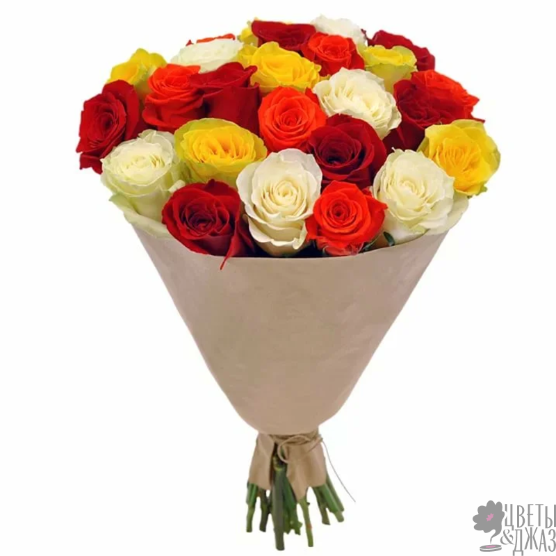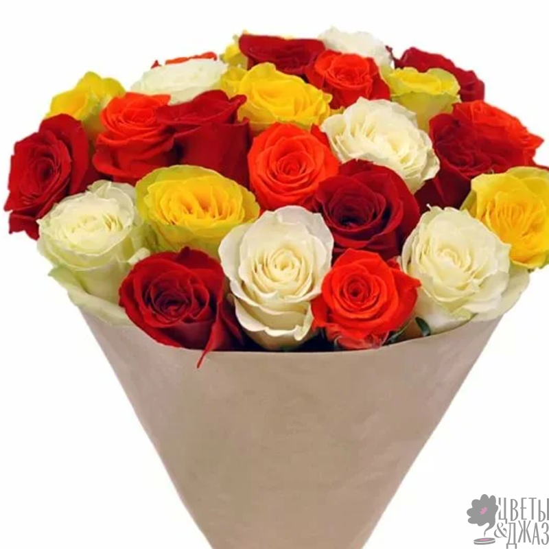 Букет состоит из MIX из 21 розы, крафт, атласная лента.