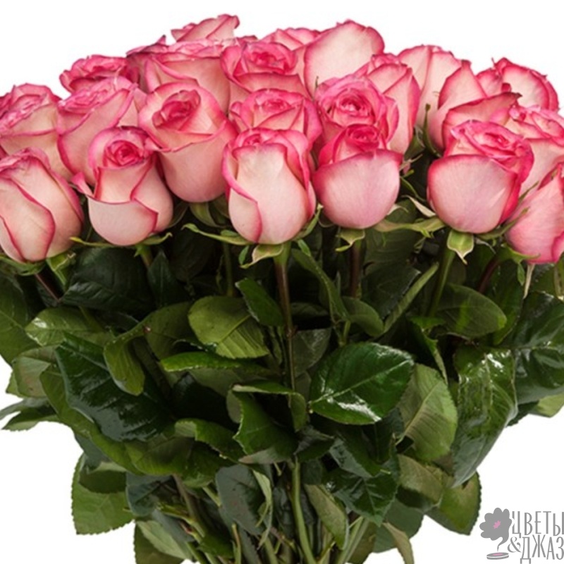 Букет состоит из 35 розовых роз, прозрачная упаковка, атласная лента.