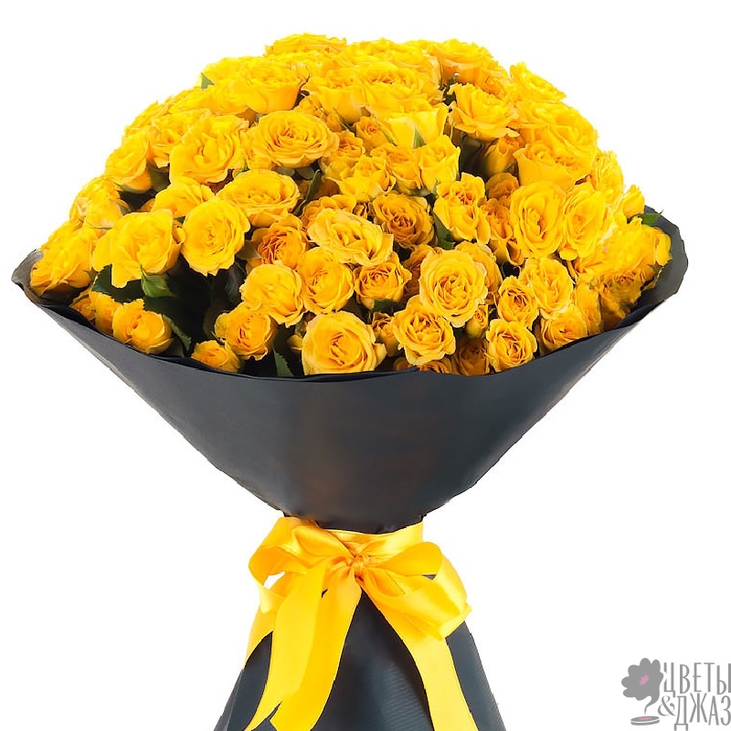 Букет состоит из 25 желтых кустовых роз, крафт, атласная лента.
