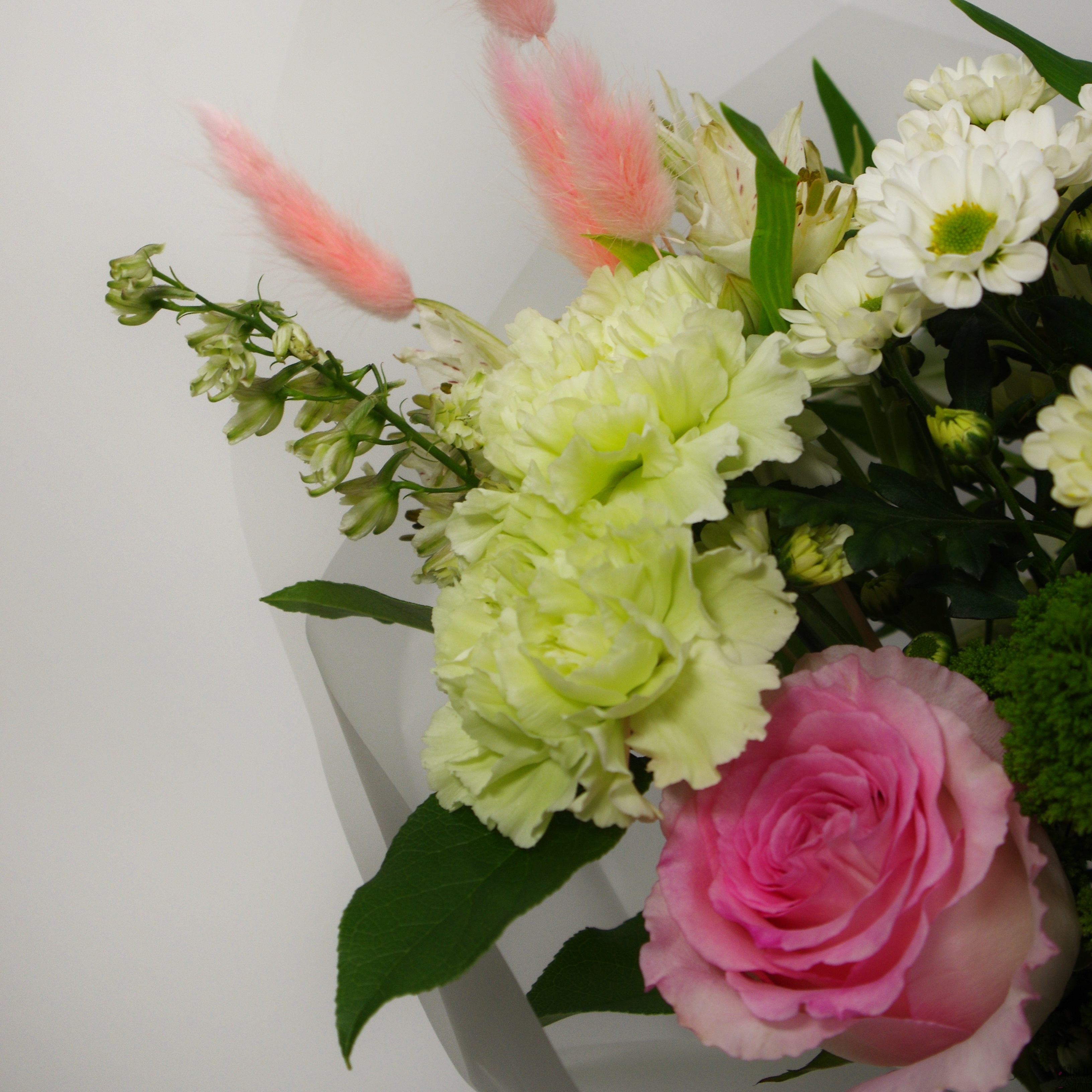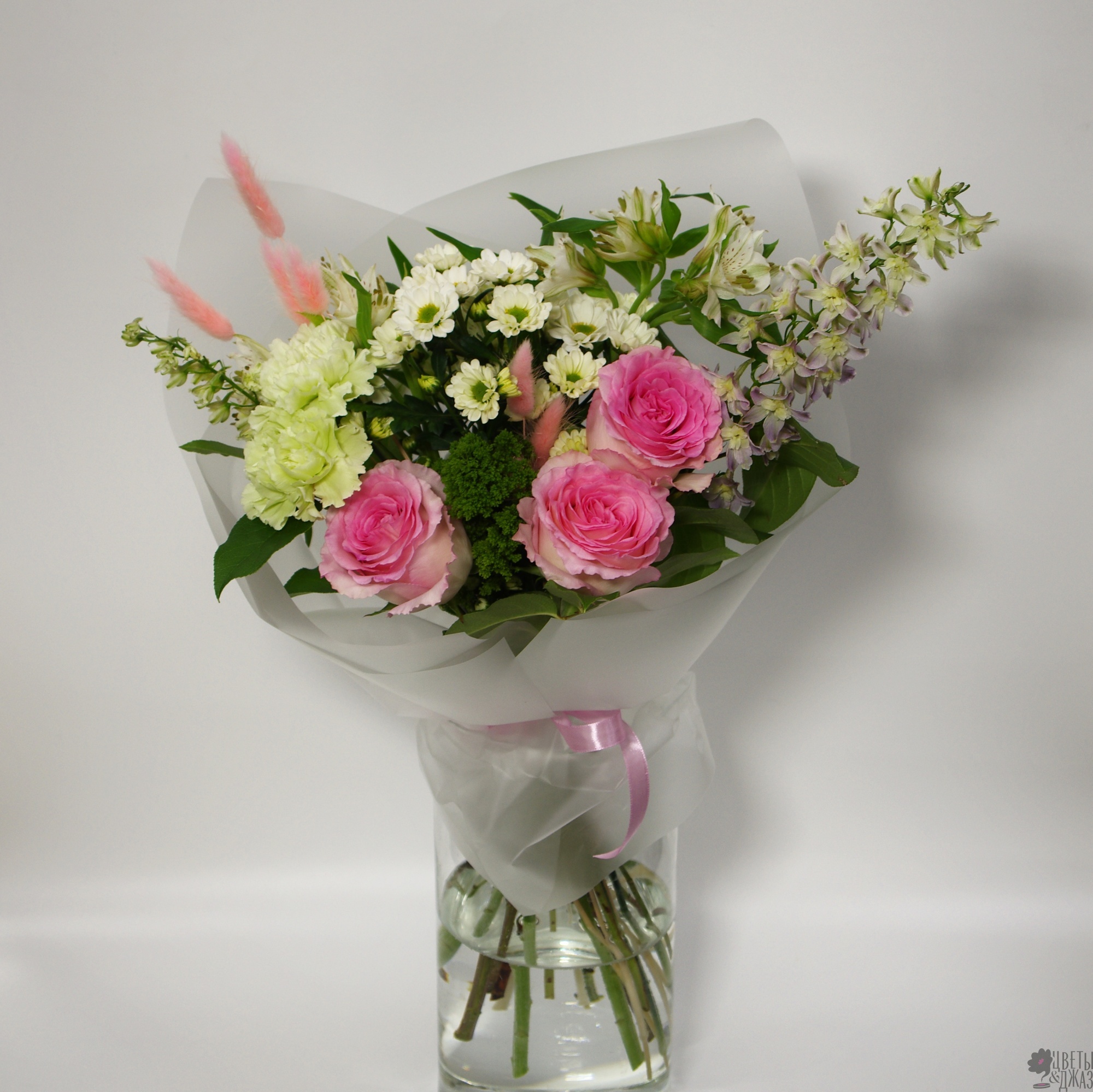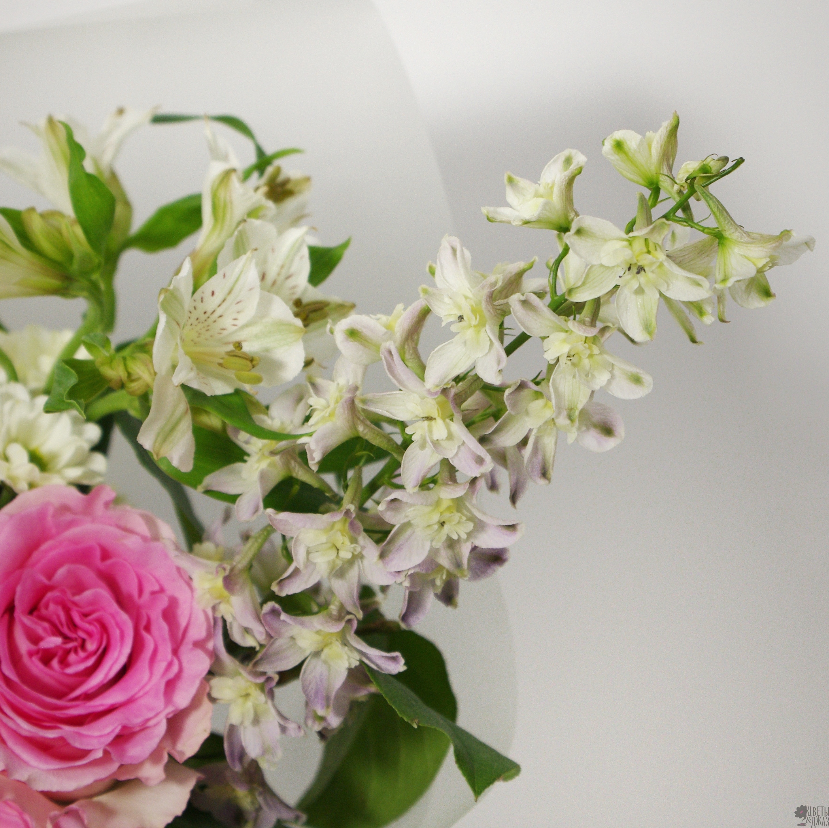 Альстромерия, Гвоздика, Дельфиниум, Роза