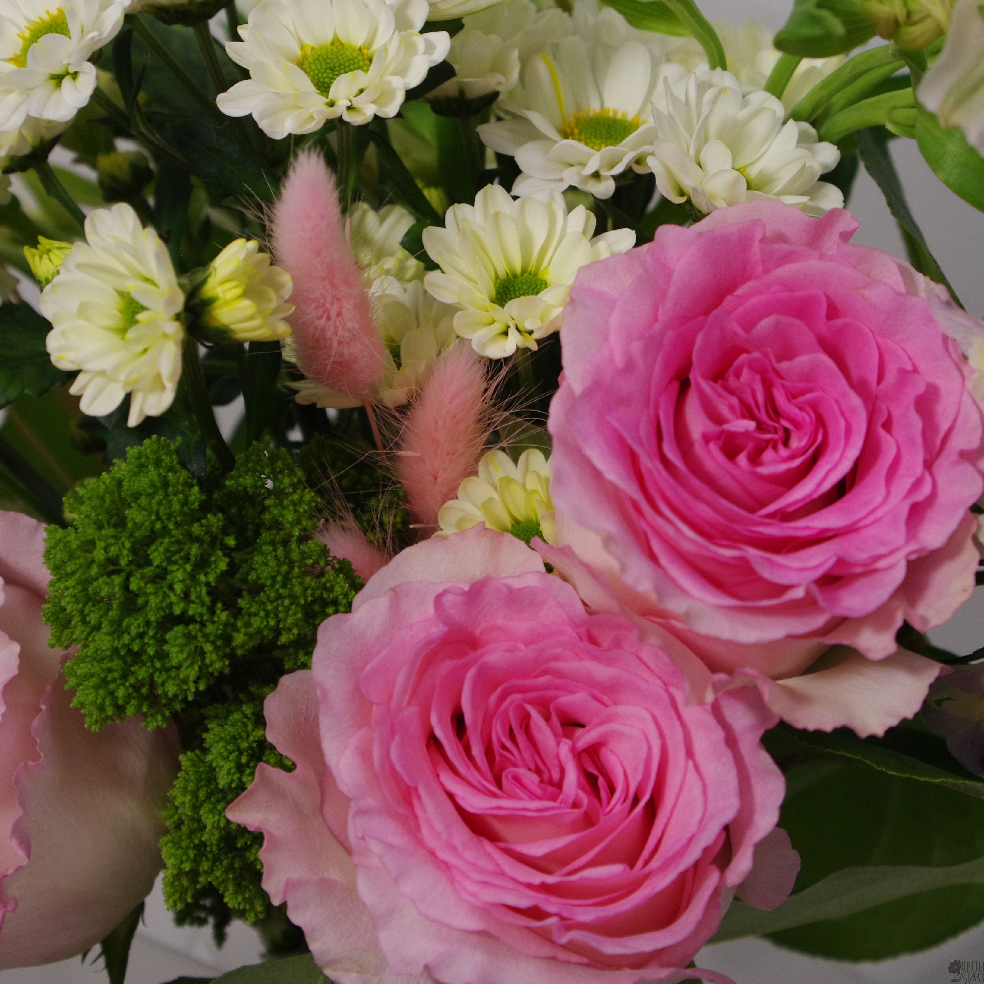 Букет с розами, хризантемами и лагурусом