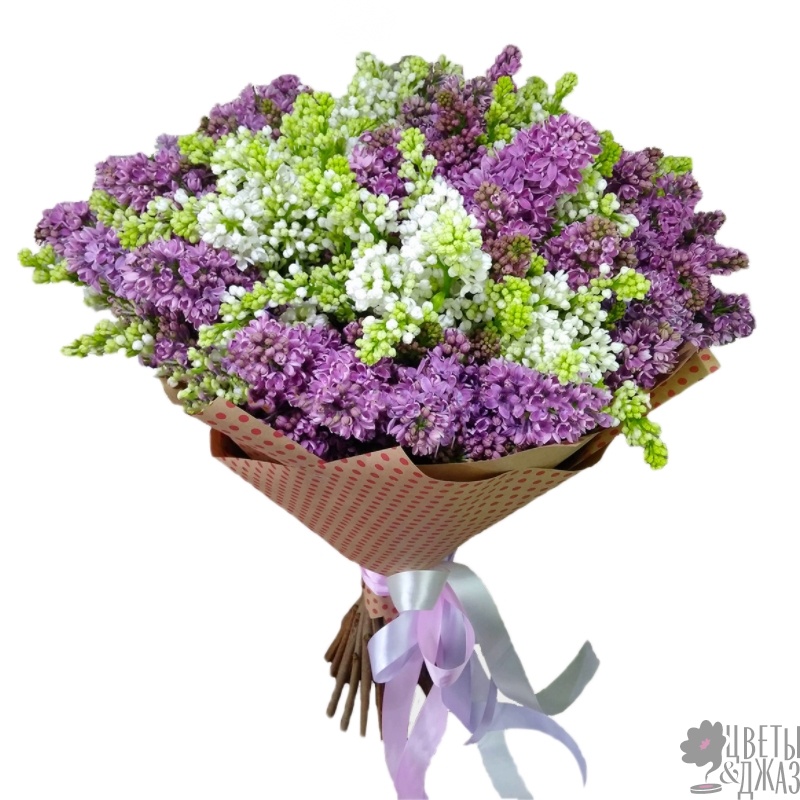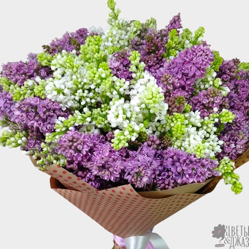 Букет состоит из 19 веток сирени, крафт, атласная лента.