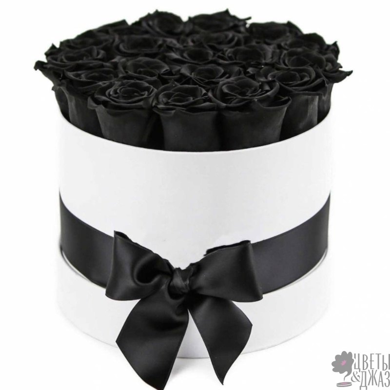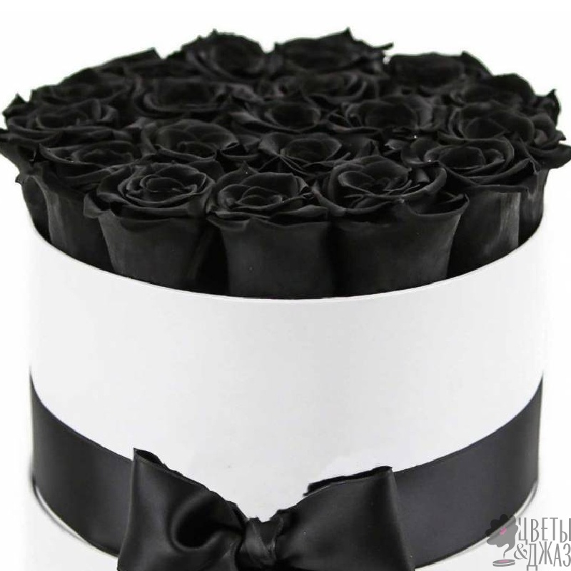 Букет состоит из 25 черных роз, коробка, оазис, атласная лента.